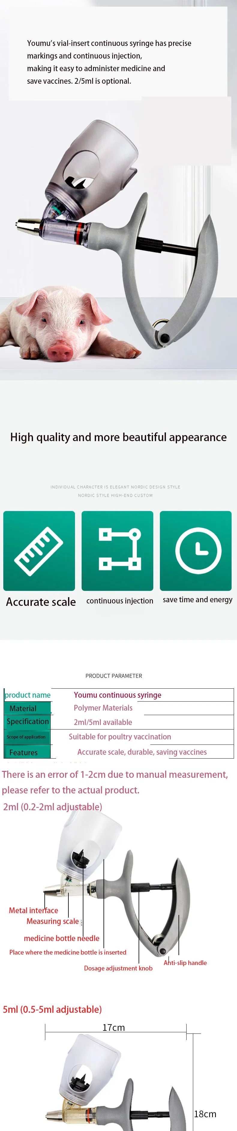 Jeringa continua veterinaria automática para animales, pollo, vaca, inyección ajustable, vacuna, cerdo, oveja, aves de corral, 2ml /5ml