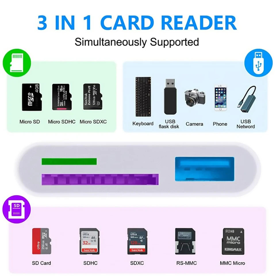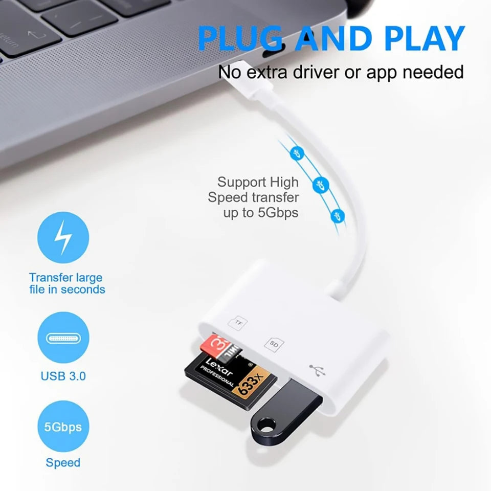 Lector de tarjetas SD TF 3 en 1 para Apple iPhone 14 12 13 11 Pro Max XR XS USB C convertidor de cámara para iPad Android Laptop adaptador OTG
