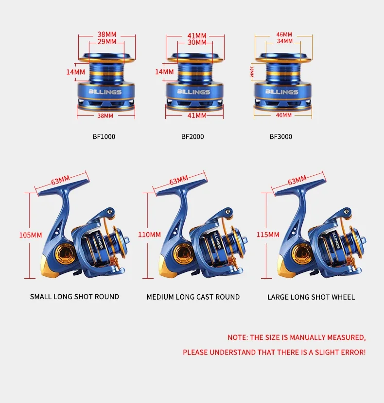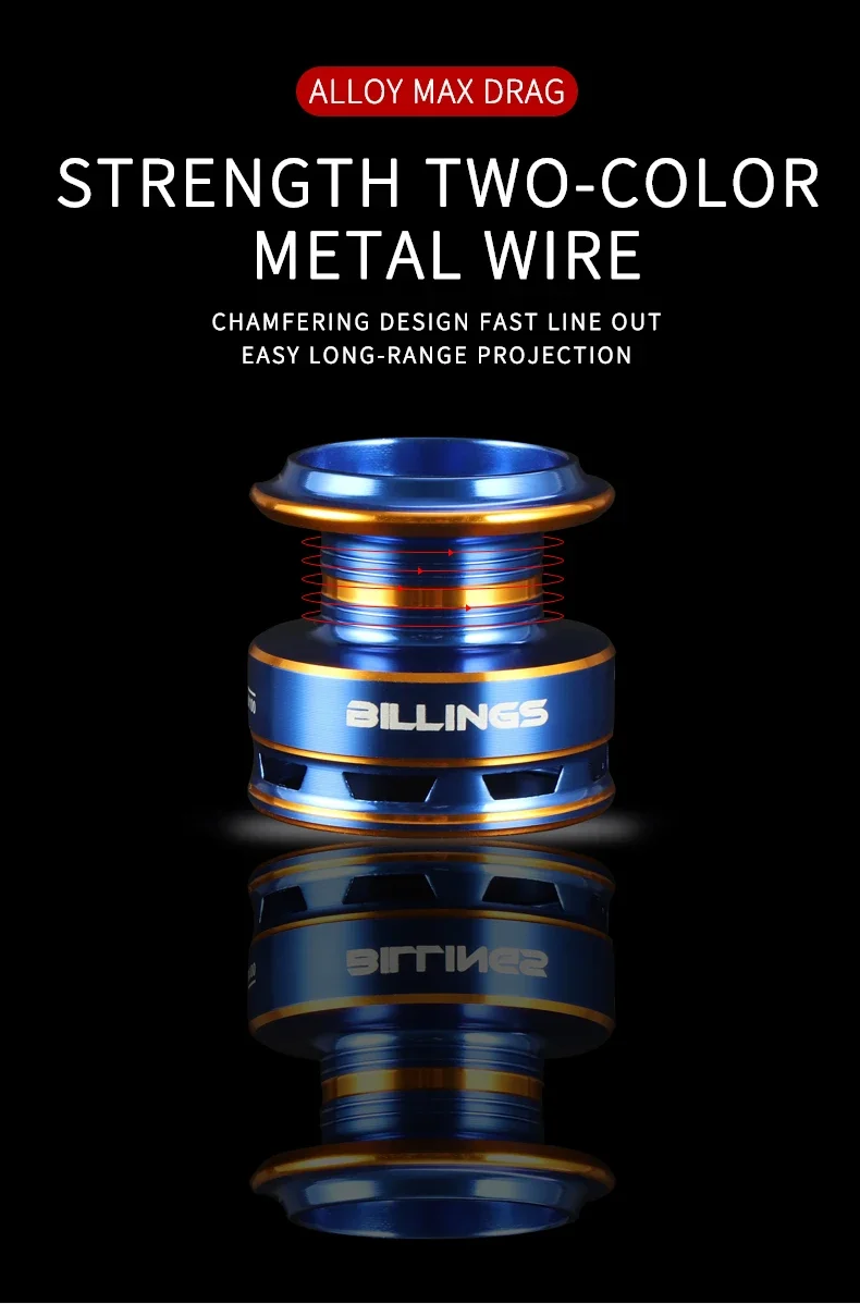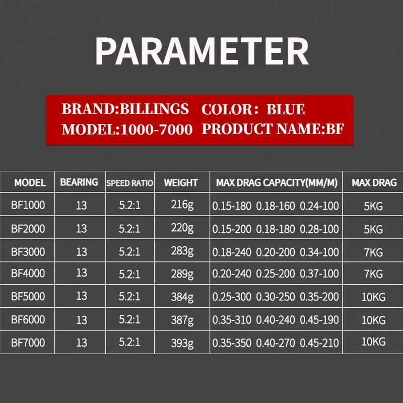 BILLINGS BF1000-7000, relación de engranaje 5,2: 1, arrastre máximo de 22 libras, carrete poco profundo, carrete de pesca giratorio, para agua dulce y salada