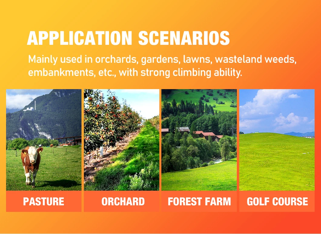 Este producto adopta el diseño de la batería Super Power 12V12A, un generador de alta potencia, un cuchillo oscilante y un sistema de marcha con orugas, adecuado para terrenos duros y desiguales con fuerte capacidad de escalada; entorno aplicable: huertos, parques, jardines, mantenimiento de carreteras, jardines de villas, etc.