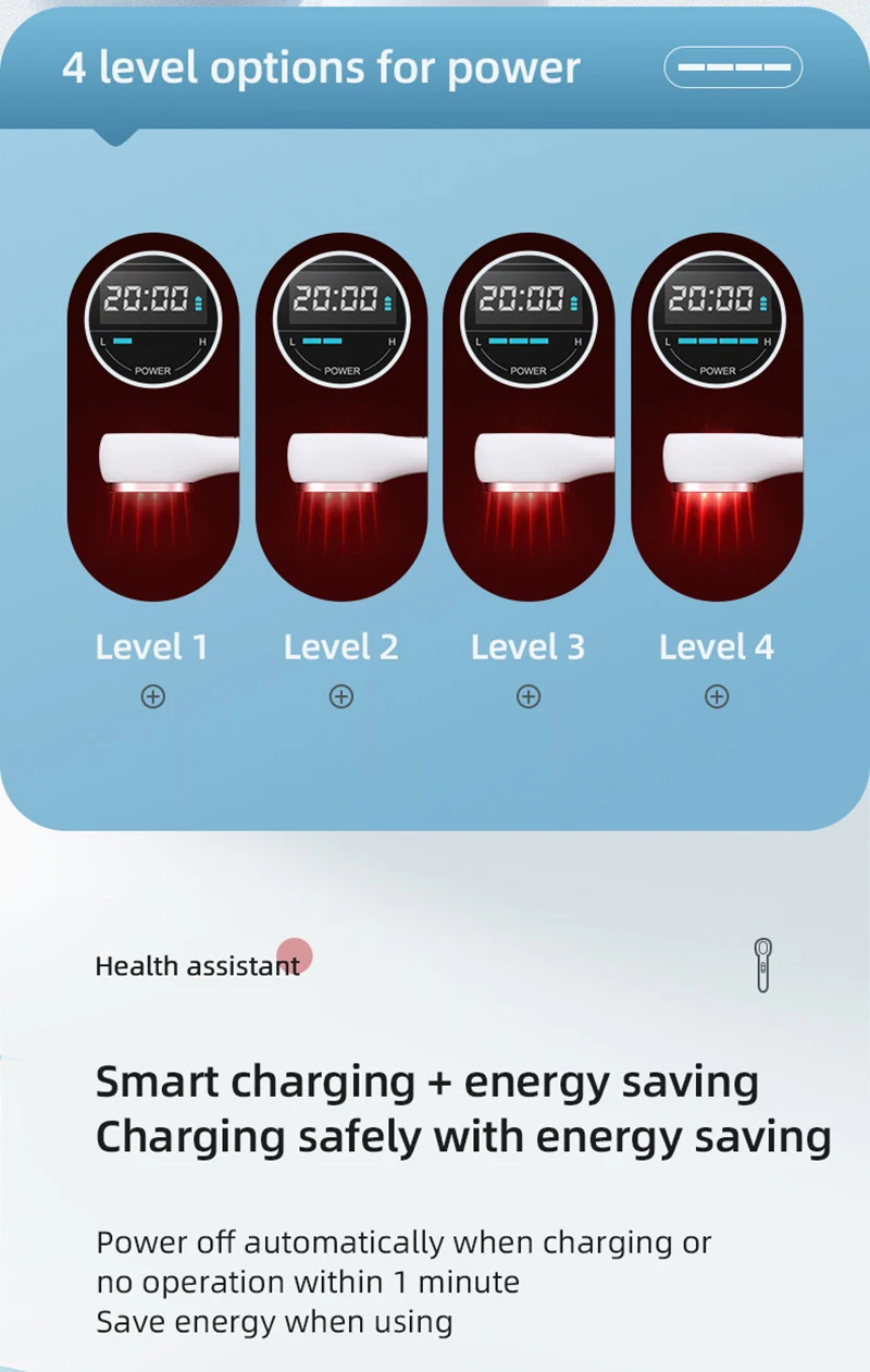 1. Terapia de luz roja de diseño mejorado: 14nm x 650nm y 3nm x 808nm. Se han añadido más luces para aumentar la eficiencia de uso. Personalice su propio modo: temporizador de 5/10/15/20 minutos. Niveles de energía para L1, L2, L3, L4. Mantén presionado el botón On/Off para encenderlo.