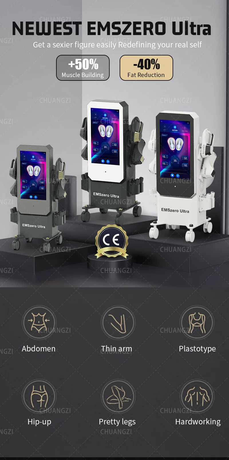 Activa los músculos del abdomen, las nalgas, las manos, los hombros y las piernas delanteras y traseras para aumentar la proporción muscular. Debido a que no hay inyección, líquido especial o tratamiento alimenticio similar para el cuerpo, no hay efectos secundarios y la estructura muscular es muy permanente. Por lo tanto, Emszero no debe mezclarse con polvo o agujas especiales que afecten la estructura muscular durante un tiempo corto para causar daños a largo plazo al sistema corporal