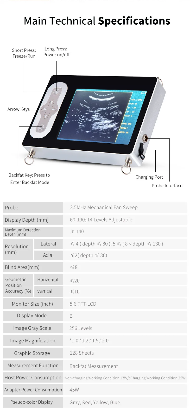? El instrumento consta de dos partes: la unidad principal y la sonda. La Sonda de barrido de ventilador mecánico impermeable S3/3,5 MHz está equipada de serie.