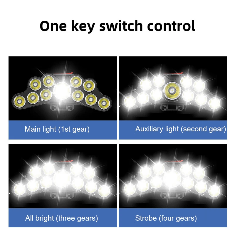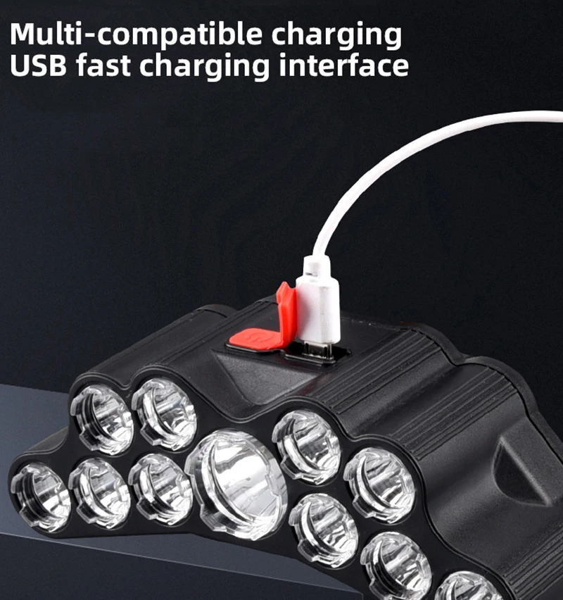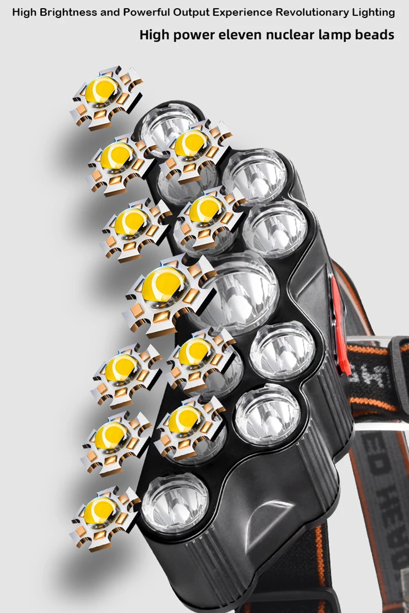 Faro recargable por USB, 11 LED, lámpara de cabeza de luz fuerte, resistente al agua, batería integrada, linterna de pesca, linterna para exteriores