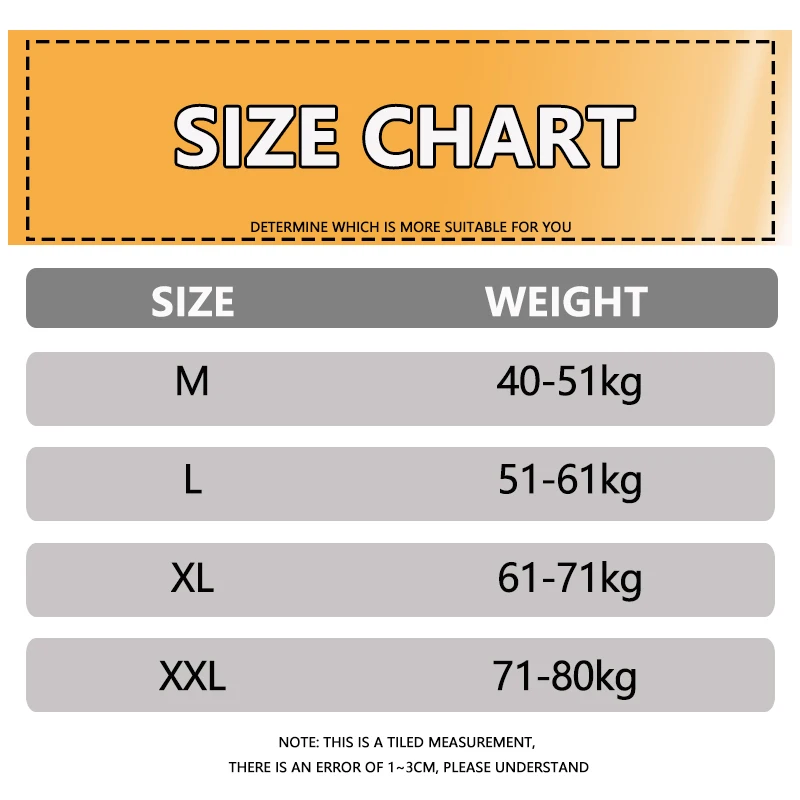 XL: cintura 63-81cm, cadera 79-107cm, peso 61-71kg