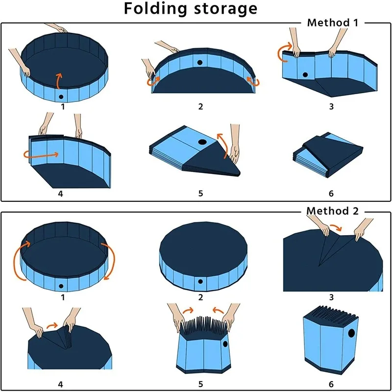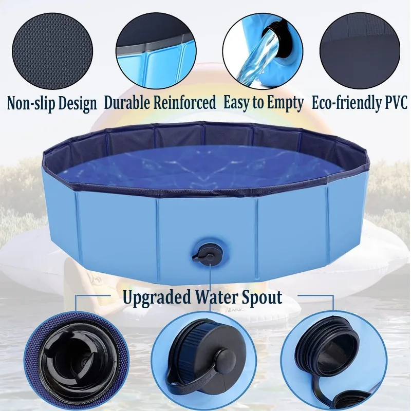 Sumergirse en la piscina. DDRENAJE PORTÁTIL: no es necesario inflar, desenrosque el drenaje para verter rápidamente el agua, cierre el émbolo para llenarlo de agua y úselo. ¡La válvula de drenaje lateral le permite vaciar rápidamente la piscina para agua! El panel plegable le permite doblar la piscina en un tamaño más pequeño para un fácil almacenamiento y llevar a su lindo perro a dar un paseo durante el verano.