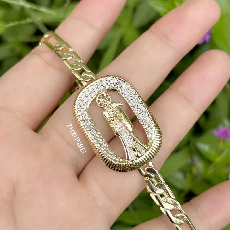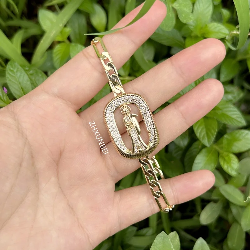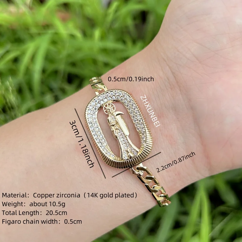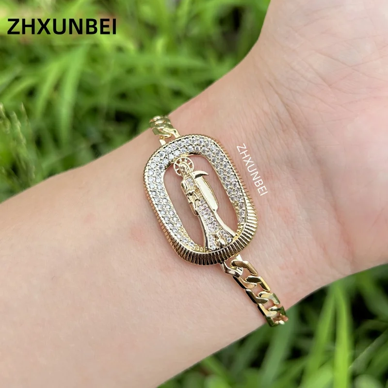 14K Gold Plated Bracelets Mexican Copper Figaro Chain CZ Jewelry Santa Muerte Charm Bangles Women Religious Holy Death Pulseras
